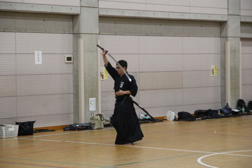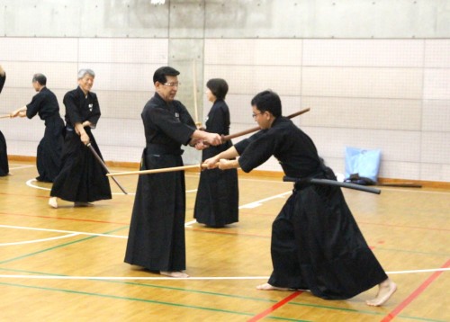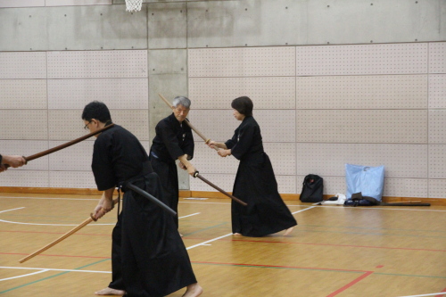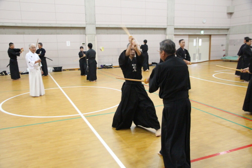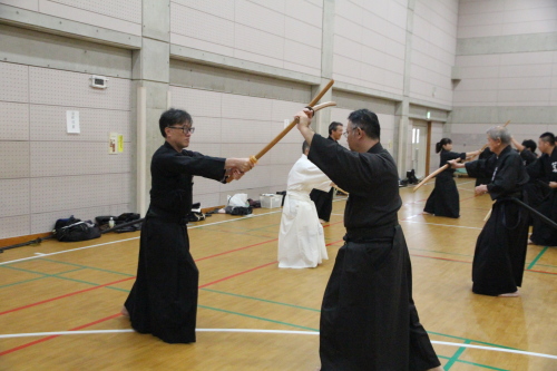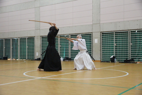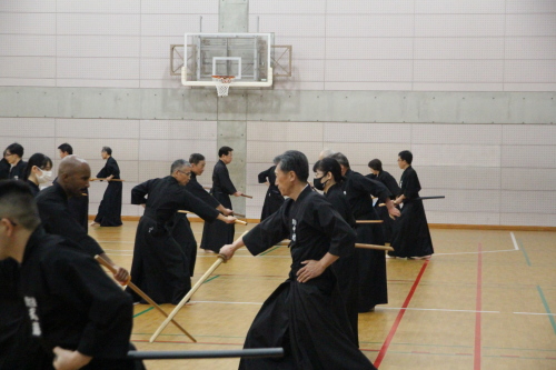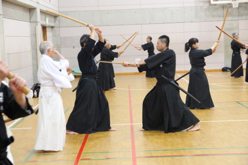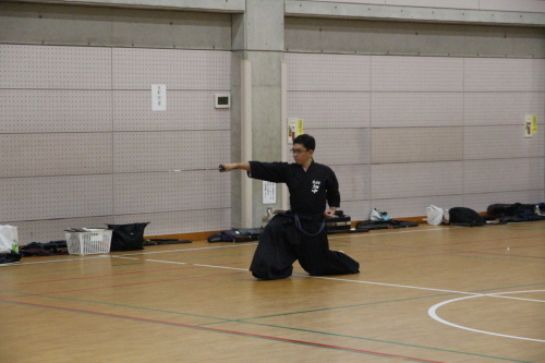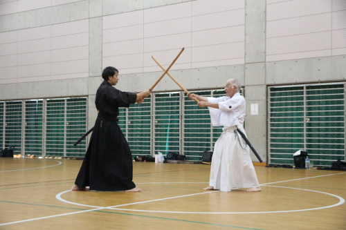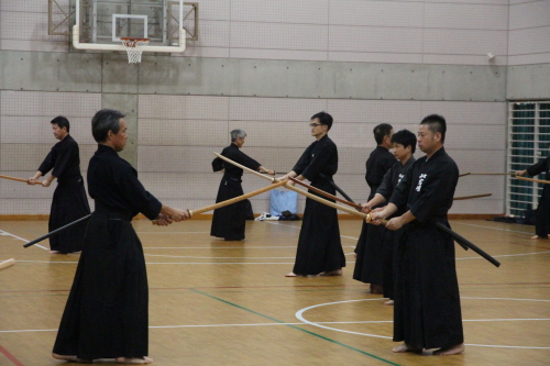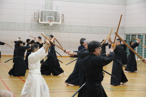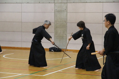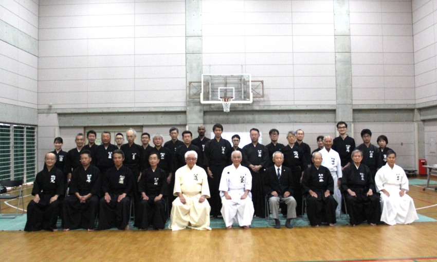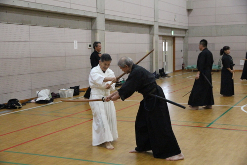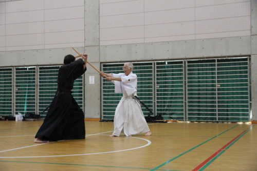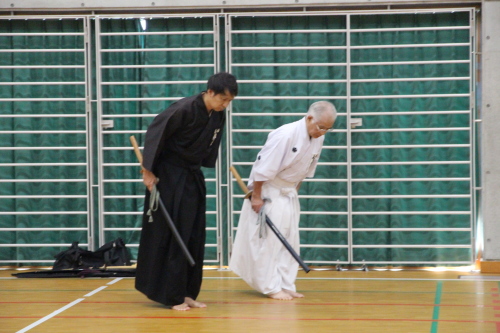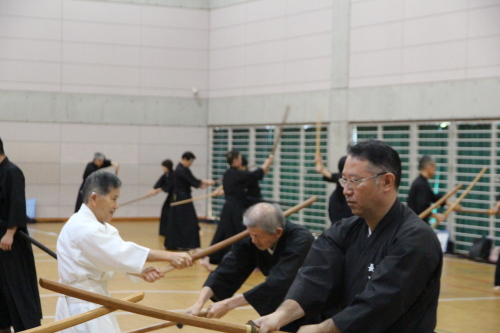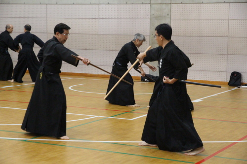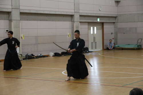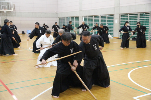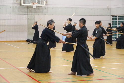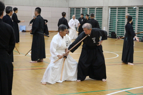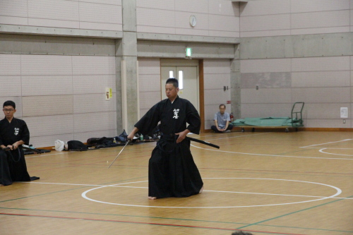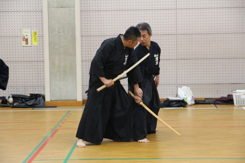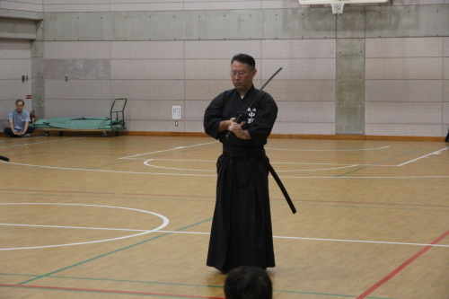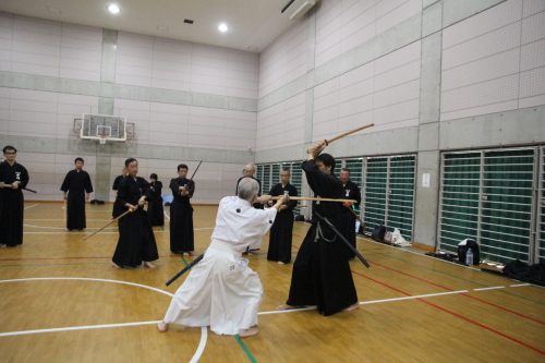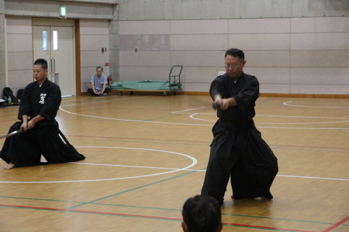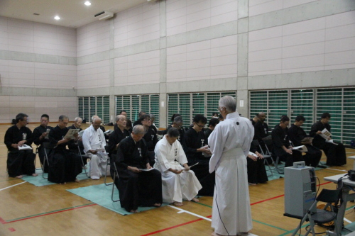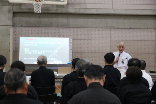 講義内容は居合道教士七段高木志伸講師より「武道家としての居合道」というテーマで講義がありました。 その後、補助講師作永憲昭居合道六段とともに英信流居合之形(組み太刀)の1本目「出会い」から7本目「真向」まで、模範実演と共に、詳しい説明がありました。