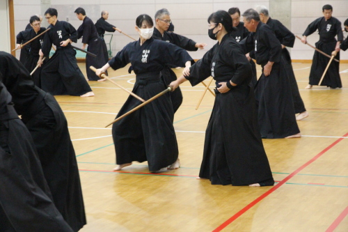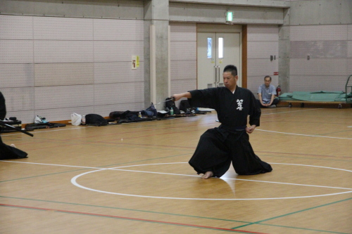 講話会終了前には講習会成果発表会ということで英信流居合之形(組み太刀)の1本目「出会い」から7本目「真向」まで、受講者全員で披露されました。