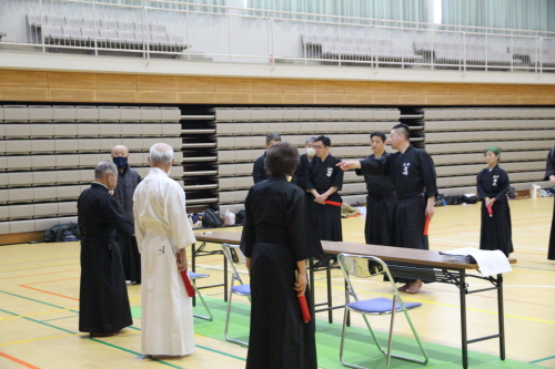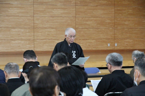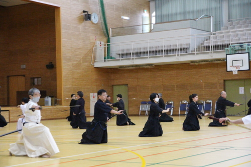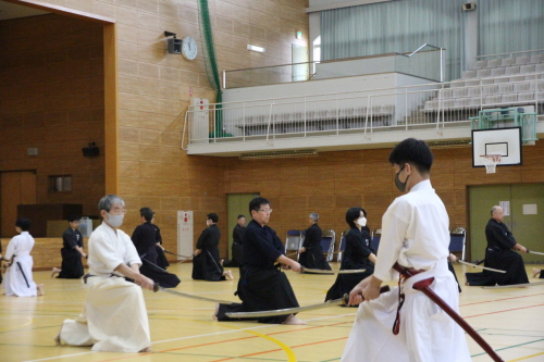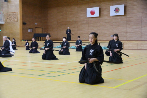 始めに、本講習会で高木先生からの指導事項や居合道とは何かの講義に始まり、その後、五段以下は全日本剣道連盟居合12本の実技講習会の稽古となりました。そこでは、基礎的な礼法からをご教授頂けました。全日本剣道連盟居合12本の要義を改めて学ぶとともに、先生方の指導により実践のポイントを知ることができました。また、段位審査会に向けて多くの学びを得ることができました。