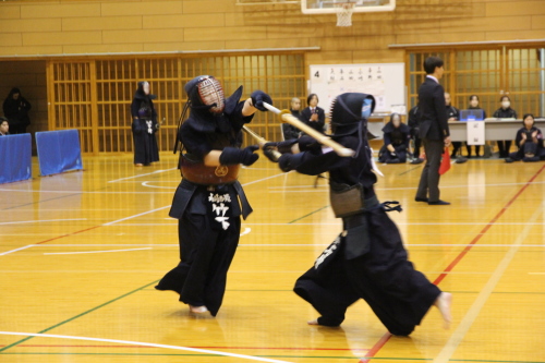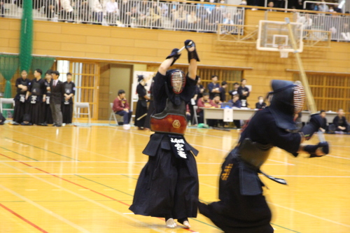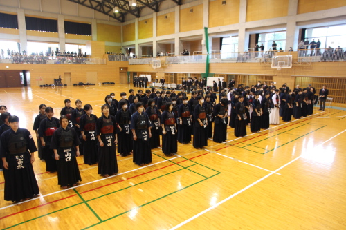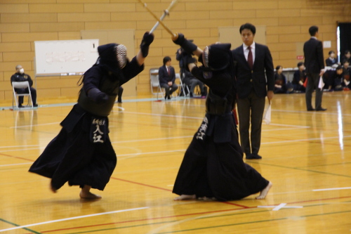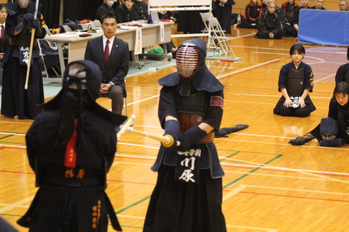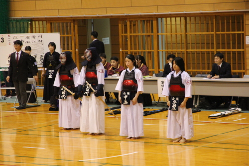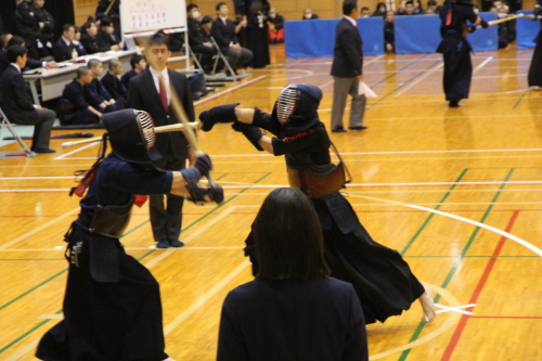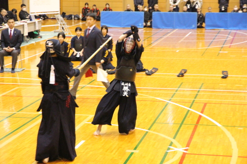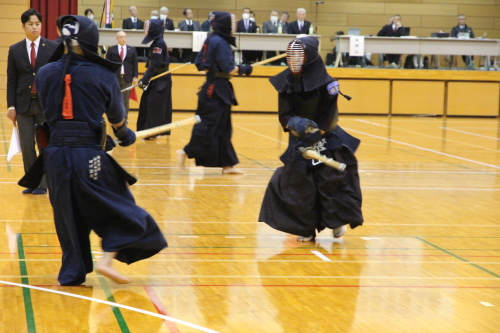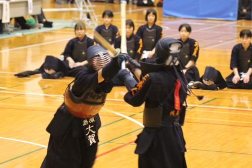女子団体戦は18校がトーナメント戦で競い合いました。長崎東高校は準決勝戦で本大会3連覇中の島原高校と対戦し、両校激しく戦い先鋒から大将まで0-0と譲らず、代表戦で宮﨑結選手(長崎東)がメンを決め、約20分間に及んだ接戦を制し決勝戦に進出しました。決勝戦は長崎東高校と西海学園高校が対戦し、次鋒の永田莉菜選手(長崎東)が序盤にメンで一本勝ちをして、このリードを大将戦まで守り切り、長崎東高校が初優勝を飾りました。