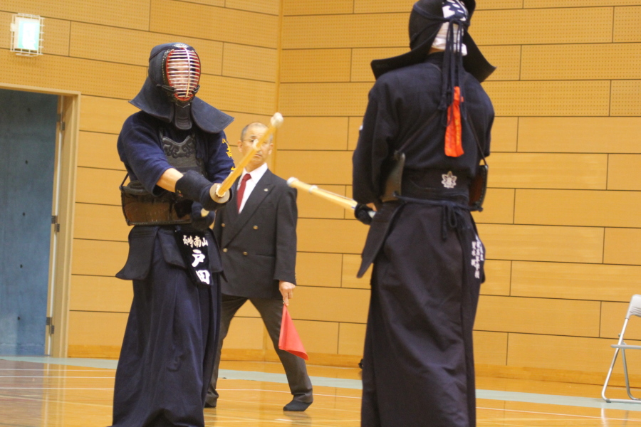 男子団体は22校がトーナメント戦で競い合いました。昨年3月島原高校が全国選抜剣道大会で優勝して全国連覇を目指して臨んだ長崎県予選でしたが、準決勝戦で長崎南山高校と対戦し、1勝1敗大将同士の代表戦となり、戸田直人選手(長崎南山)が渾身の飛び込みメンを荒木瑛選手(島原)に決め、長崎南山高校が決勝戦に進出しました。決勝戦は長崎南山高校と海星高校が対戦し、先鋒の馬場仁亜選手(長崎南山)がメンの2本勝ちで勢いをつけ、4-1で優勝を飾りました。