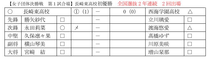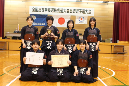 女子代表の長崎東高校は昨年10月の長崎地区新人大会や11月の県新人大会で優勝し、昨年12月末に将龍杯(大分県)で3位となり、九州各地で遠征を重ね地力をつけました。長崎東高校は昨年の全国選抜剣道大会では予選リーグで秋田商業に2-0で勝利し、東海大菅生高校(東京都)に2-1で敗れ予選敗退となりました。その悔しさを挽回し、全国制覇を目指しています。