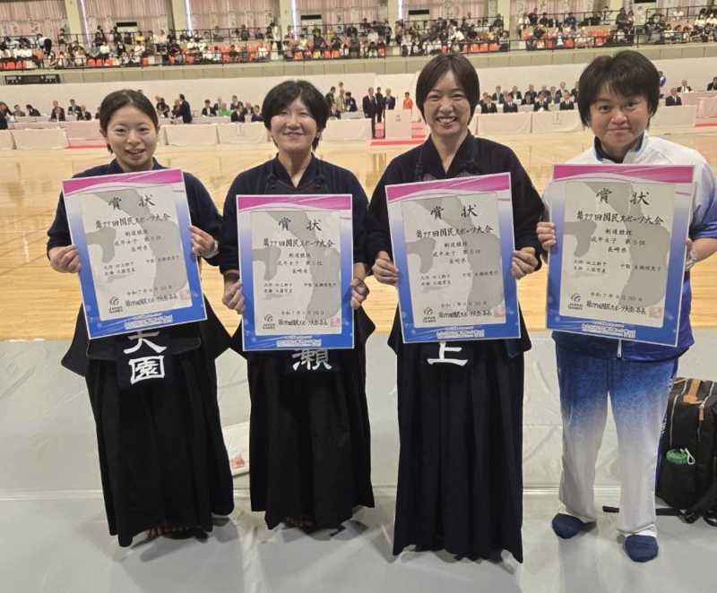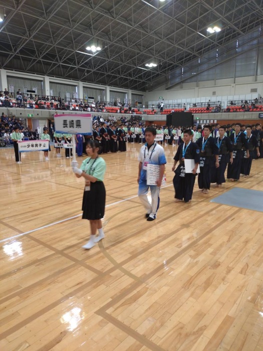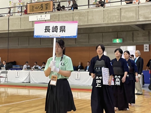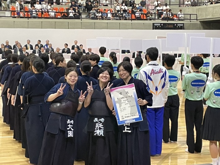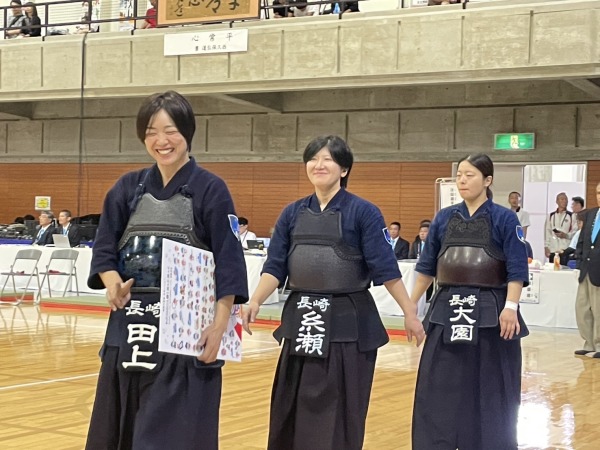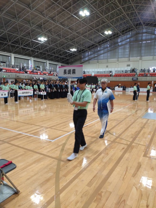 令和7年9月29日(月)〜10月1日(水)、滋賀県湖南市総合体育館において標記大会が開催されました。 厳しい九州ブロックを勝ち抜いた成年女子、少年男子、少年女子の3部門及び成年男子は長崎国体以来全種目本国スポ出場をしました。 成年女子は1回戦大阪府と対戦し、1−1本数差で勝利し2回戦で東京都に0‐3で敗れ、5 位入賞、少年男子は3位決定戦で佐賀県に2−0で勝利し3位入賞、少年女子は1回戦で大阪府に1−1本数で惜敗、成年男子は3回戦で静岡県に1−2で惜敗しベスト16。長崎県チームはそれぞれの部門で活躍し、総合6位入賞という素晴らしい結果でした。 この事は国スポ選手強化稽古及び合同稽古会を県内外各地で実施したなかで選手の皆さんが実力を本試合で充分に発揮され、最高の試合ができたものだと思います。おめでとうございました。 |