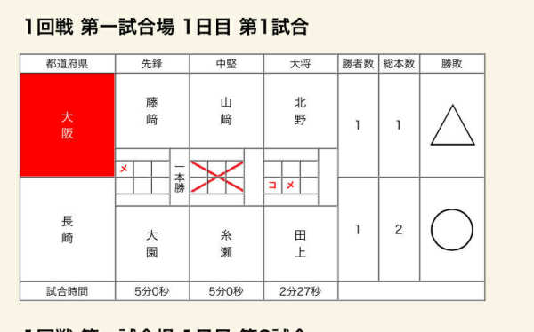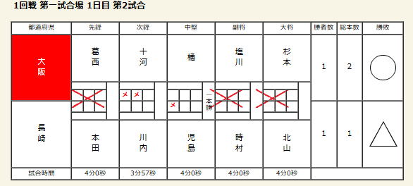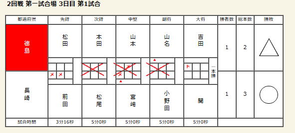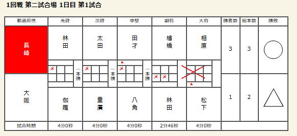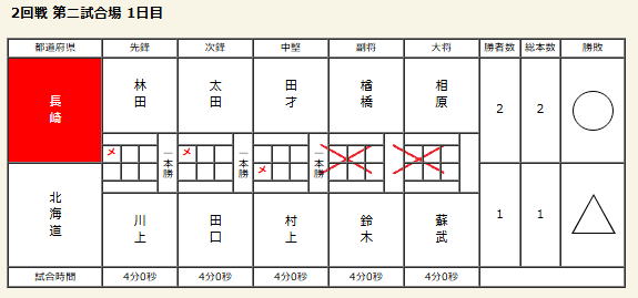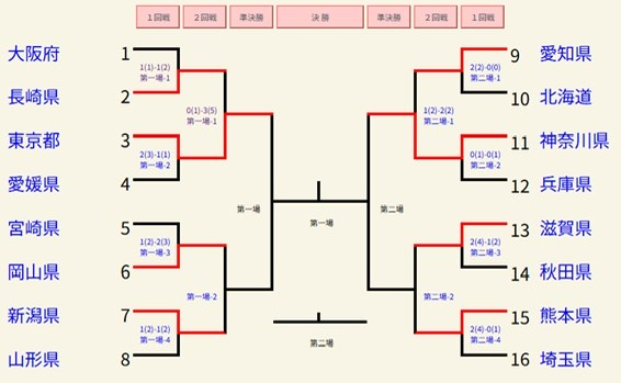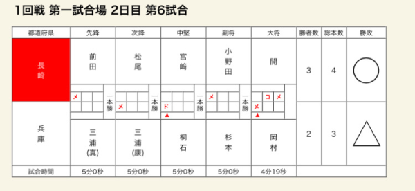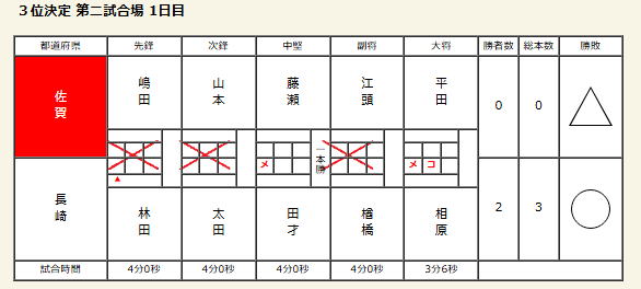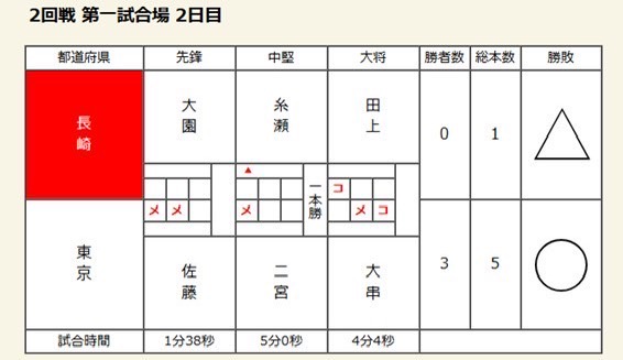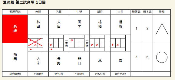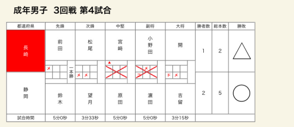 【成年男子】 ベスト16 【1回戦】 ○長崎県 3‐2 兵庫県△ 【2回戦】 ○長崎県 1‐1 徳島県△ 本数勝ち 【3回戦】 △長崎県 1‐2 静岡県○