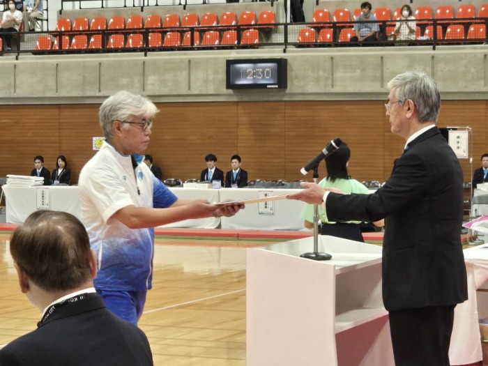 総合成績6位入賞 | 藤原崇郎 全剣連副会長から 藤原昌史 長崎県剣道連盟理事長に 6位入賞が授与される |