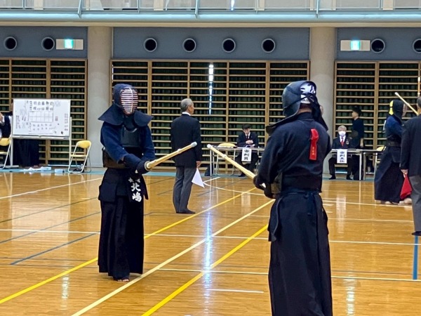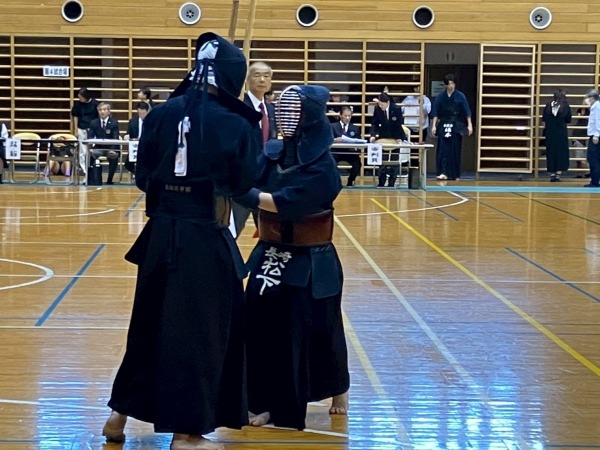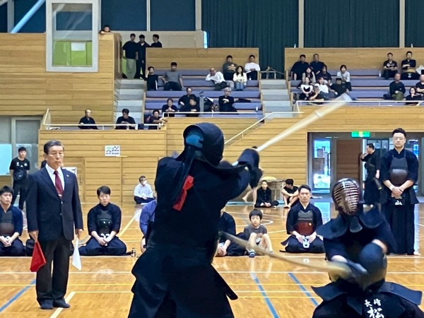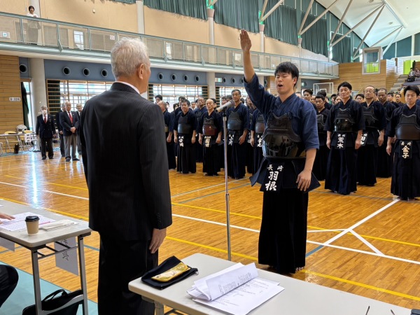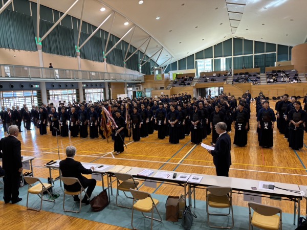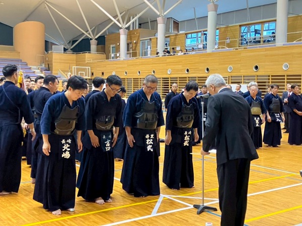 | 令和7年10月26日(日)、諫早市森山スポーツ交流館において標記大会が開催されました。 清々しい秋晴れの中、盛大に開催することができました。 県内各地から55歳以上11チーム、35歳以上19チーム、34歳以下15チーム、の選手が出場しました。 試合結果は55歳以上の部 学校剣道連盟、35歳以上の部 真志黒翔会 (県警)、34歳以下の部 長崎警察機動隊Aが優勝しました。 |