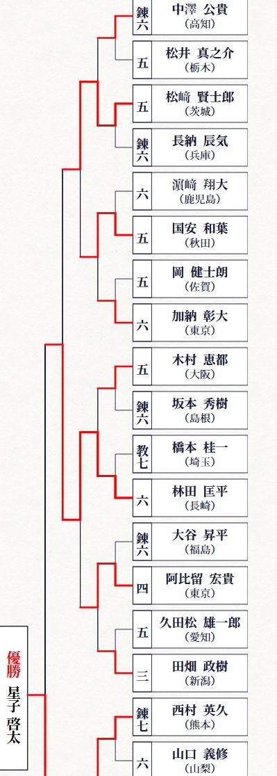 | 【 1回戦】 ○林田匡平(長崎県)メ− 橋本 桂一(埼玉県)△ 【 2回戦】 ○林田匡平(長崎県)メ− 木村 恵都(大阪府)△ 【 3回戦】 ○林田匡平(長崎県)メ−延長− 阿比留 宏貴(東京都)△ 【 準々決勝戦】 ○林田匡平(長崎県)メメ−メ 松ア 賢士郎(茨城県)△ 【 準決勝戦】 △林田匡平(長崎県)メ−メコ 星子 啓太(東京都)○ |