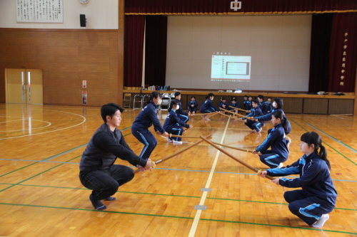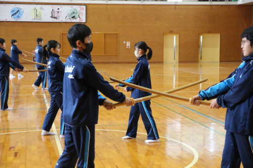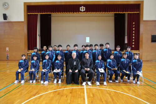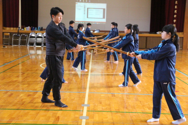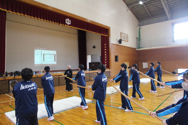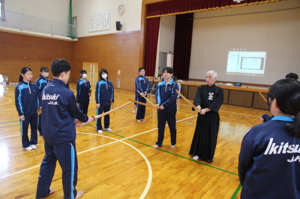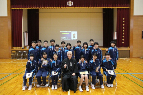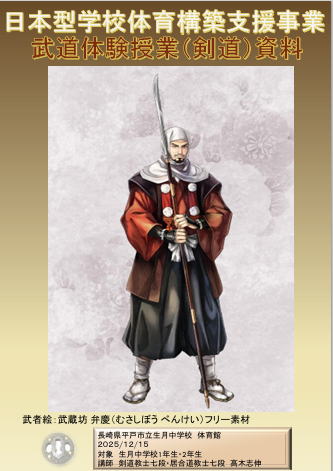 | 生月中学校 武道体験授業(剣道) ―― 剣道を通して、日本の伝統文化を伝える ――― 授業支援者 剣道教士七段・居合道七段 高木 志伸 令和7年 12月15日(月)、平戸市立生月中学校体育館において標記の支援事業を実施しました。体験授業参加者は生徒:1年生 27名、2年生 21名、教師:2名 計50名でした。 生月中学校は平戸市北部の島にある小高い場所に位置する小規模中学校です。平成17年に 平戸市と市町村合併により平戸市立生月中学校となり、令和8年には創立60周年を迎えます。 地域の子どもは地域で育てるとの思いを引き継ぎ、少子化と地域の縮小化の中でも教師と生徒 が一体となってしっかりとした学校教育に取り組んでいて大規模校にはない、個々の良さを引き出 す心配りのある教育をすすめています。特に地域の武道に対する意識も高く、空手や剣道がとて も盛んで地域の道場も多く、日本人のあるべき姿や日本の伝統文化の大切さ、日本人の心を大 切にするということを日頃の教育活動に取り入れています。 今回の剣道授業支援では剣道の歴史や立ち振る舞いの「所作」に生徒が実際にふれることで、 古来より伝わってきた武道の素晴らしさや日本人としての心の大切さを学ぶことを目的としたもの でした。 |