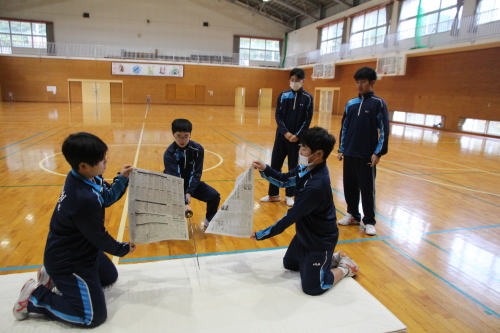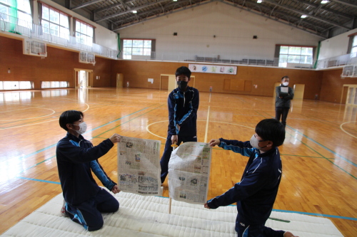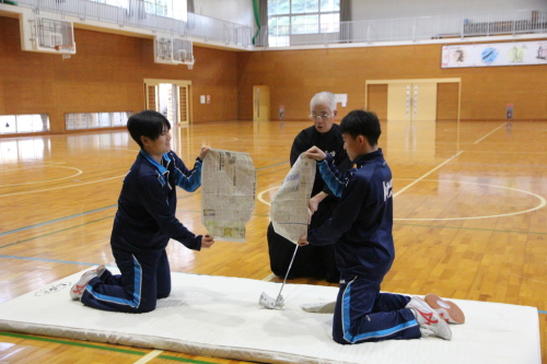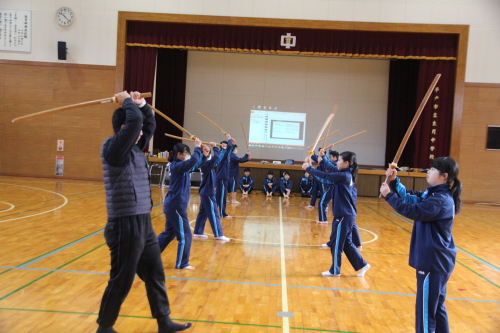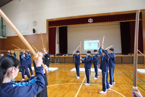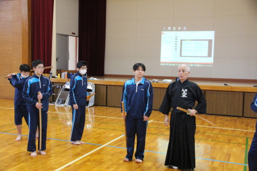 | (3)実践内容 @ 日本の伝統文化とは何なのか、自分達の身の回りには何があるのか、授業の中で学ぶ。 1)授業講習内容 令和7年12月15日(月) 50分×2=100分 @) 講義@ 剣道を通しての日本の伝統文化を知る ・・・・・(パワーポイント)(15分) A) 実技@ 木刀での新聞斬り体験・・・・・・・・・・・・・・・・・・木刀 (15分) B) 実技A 所作 ・・・・・・・・木刀(20分) T)礼 体育館への礼、先生への礼、相互の礼、木刀への礼 U)木刀の所作・・・持ち方、抜き方、振り方、置き方 V)五業の構え・・・上段、中段、下段、八相、脇構え W)木刀の振り方 C)休憩 (10分) D)実技B 日本剣道形(30分) ア)打太刀、仕太刀、掛け声(ヤー、トー) イ)日本剣道形 一本目 ウ)日本剣道形 二本目 エ)日本剣道形 五本目 E) 実技C 生徒成果発表(15分) 生徒演武 4班に分かれ日本剣道形3本を演武 F)まとめ・・・・・(5分) 生徒感想をまとめ、考察する。 |