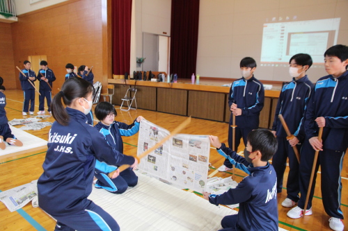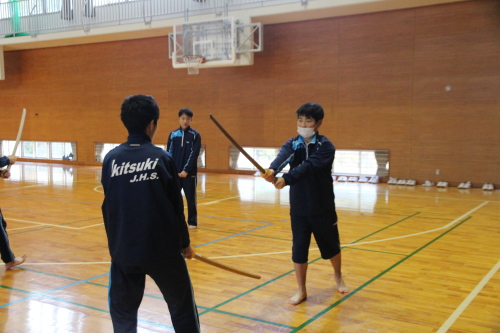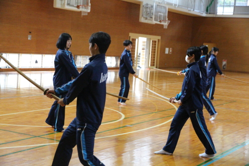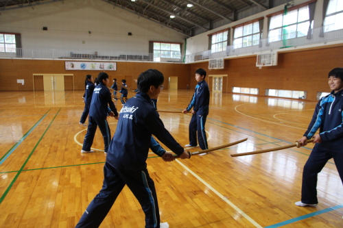 | 写真:実技で 日本剣道形を真剣に取り組む生月中学校の生徒達 | |||||||||||||||||||||||||||||||||||||||||||||||||